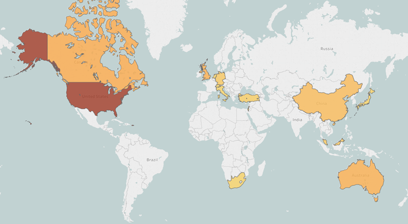 Figure 1. Countries with targeted universities. The darker the color, the higher the number of affected universities. (Source: Secureworks)
