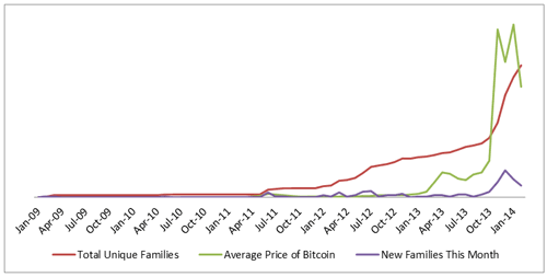 The trend shown in Figure 1 closely follows the overall price trend of Bitcoin. As Bitcoin has become more valuable, more malware authors are targeting it. The record-breaking highs in Bitcoin value from the end of 2013 into 2014 have been accompanied by record-breaking numbers of new CCSM families.