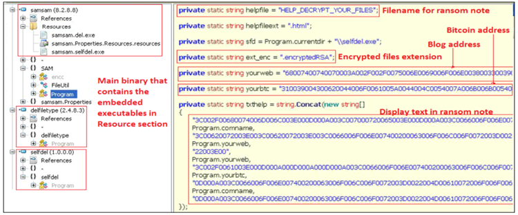 - SamSam — This custom ransomware .NET binary originally contained two embedded executables: del.exe or delfiletype.exe (SDelete Sysinternals program) and selfdel.exe (used to delete its malicious activity) (see Figure 3). A variant from mid-2016 included a single SDelete binary hidden in the resource section and created a Windows batch script to perform some of the 'self-delete' functionality previously provided by selfdel.exe. Samples from October 2017 that used the .stubbin extension included additional changes such as use of a .NET loader to decrypt and execute the payload.