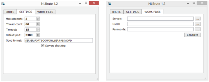 Figure 5. Screenshots of the NLBrute RDP brute-force tool. (Source: Secureworks)