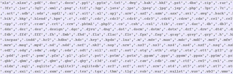Figure 7. Examples of hard-coded targeted file extensions. (Source: Secureworks)