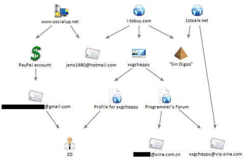 Figure 12. Tracing the connections between socialup.net, i-tobuy.com, and 1stsale.net.