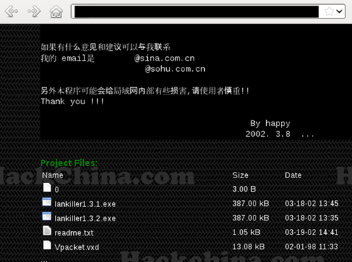 Also included in the lankiller archive is a README file that describes the use of the tool. It asks the user to email the author at either @sina.com.cn or [email protected].