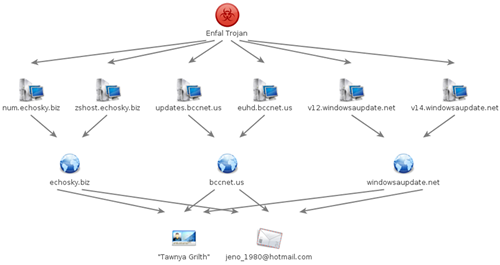 There are two primary malware families involved with the Sin Digoo domains. One is known as "Enfal", which is short for "EtenFalcon", a string found inside early samples. The involvement of actors using this malware for espionage was first detailed in 2010 in a joint report by the Information Warfare Monitor and the Shadowserver Foundation. The report, titled "Shadows in the Cloud: Investigating Cyber Espionage 2.0," was a continuation of research from an earlier report titled "Tracking GhostNet: Investigating a Cyber Espionage Network." A later report by antivirus firm Trend Micro titled "The LURID Downloader" further details a campaign of espionage by this malware against targets worldwide.