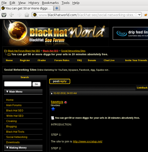 The socialup.net website has been repeatedly promoted on blackhat SEO message boards by various personas, including one named "Tawnya".