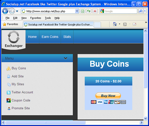 Once a user signs up with socialup.net, they can earn virtual "coins." The coins can be used to promote the user's websites or social media posts, either by viewing ads or liking other users' stories and links. A user can also buy coins from the owner of socialup.net using PayPal.