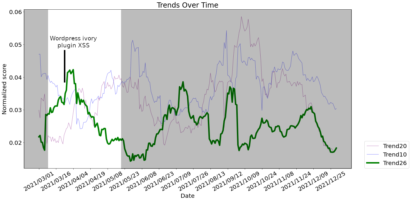 Following this trend over the past months, we see a peak in score in March 2021. This coincides with the publication of a WordPress ivory plugin XSS, which affected 60,000 domains. This event generated online discussions, which in turn were reflected in our trends.