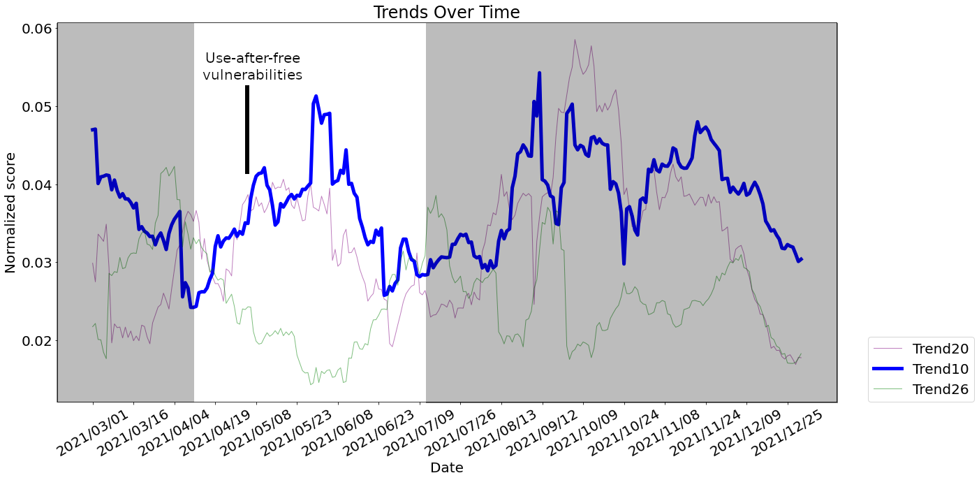 When exploring the evolution of this trend, we can observe a peak of interest around the end of March 2021. This is related to a controversy where researchers introduced use-after-free vulnerabilities in the Linux kernel as part of a research project. An important aspect of our approach can be seen here: although the vulnerabilities in question were not critical, they generated a lot of interest over use-after-free vulnerabilities. This in turn influences attackers in their choice of attacks, hence the importance of identifying the underlying concepts of vulnerabilities.
