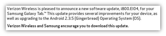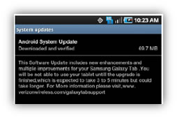 As with many Android devices, updates to the Galaxy Tablet 7 can be received over-the-air (OTA). An OTA update is passively downloaded to the device which in turn notifies the user that a software update is available and can be applies at the user's leisure. Verizon's Galaxy Tab support page, has documents to both catalog the benefits of updating and an instructional document for the software update. Here we are specifically referring to the 69.7MB EI04 update for the SCH-I800.