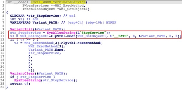 CTU analysis and the REvil persona's posts suggest that GOLD SOUTHFIELD was forced to restore the REvil codebase from a backup of version 2.06. Changes made in versions 2.07 and 2.08 were reverted in the analyzed September 2021 sample. For example, the original 2.06 version includes a function to terminate prohibited services that stored its strings in an unencoded state (see Figure 2).