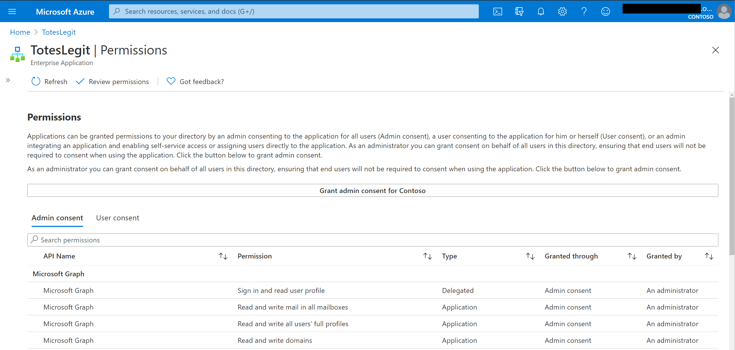 - Application permissions — These permissions are only granted to a service principal when an administrator grants consent to an application. The service principal in that tenant associated with the application can then access resources outside the context of a particular user (e.g., use the Microsoft Graph API to read all contacts, all email inboxes, or all files in an organization). The service principal's AppRolesAssignedTo attribute records which resources and permissions the application was granted consent to by the administrator.