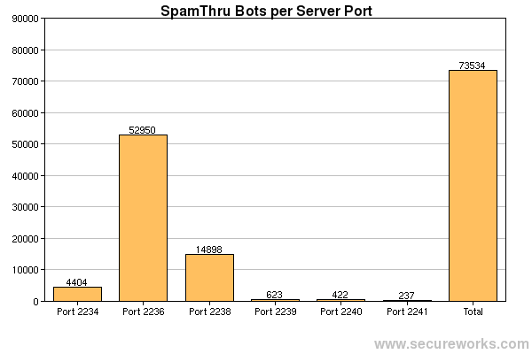 SpamThru operates in a limited peer-to-peer capacity, but all bots report to a central control server. The bots are segmented into different server ports, determined by which variant of the trojan is installed. The bots are further segmented into peer groups of no more than 512 bots, keeping the overhead involved in exchanging information about other peers to a minimum. In the following graph, the total count as recorded by the control server is shown for each control port.