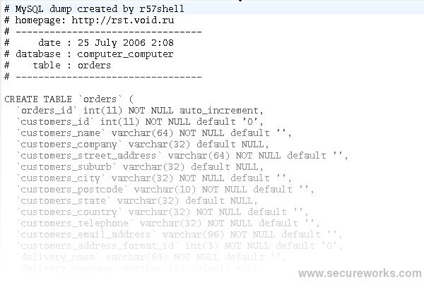 In the image below, we can see the result of one such hack, in one of the files found on the control server. In this case, the MySQL database of an online shop appears to have been downloaded using a tool called r57shell. We know this was done in order to extract email addresses, since a file containing just the email addresses from the MySQL dump was found in the same directory.