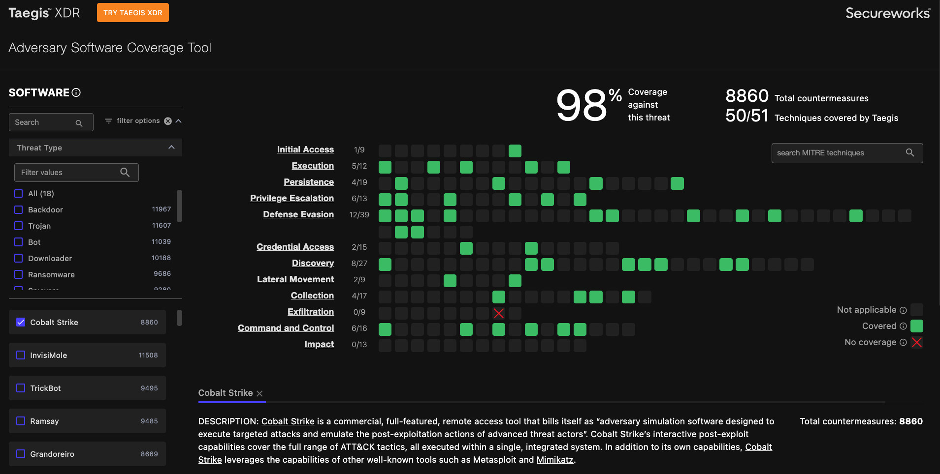 Interactively explore how Secureworks Taegis XDR maps coverage and countermeasures to the tactics and techniques used by over 500 adversarial software types with XDR Adversary Software Coverage (ASC) tool.